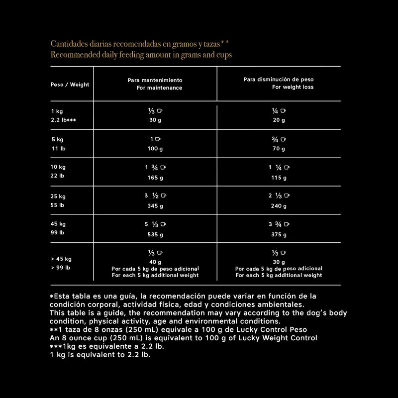 Lucky Control de Peso es un alimento premium formulado para ayudar a tu mascota a mantener un peso ideal sin sacrificar sabor ni nutrición. Su fórmula contiene un contenido reducido de grasa y calorías, ideal para perros con tendencia al sobrepeso o esterilizados. Enriquecido con L-carnitina, favorece la quema natural de grasa y su conversión en energía, mientras que su alto contenido de fibra ayuda a prolongar la sensación de saciedad y controlar el apetito. Además, su fuente de proteína de alta calidad proveniente del salmón contribuye a mantener una masa muscular firme y saludable, apoyando al mismo tiempo el control del peso corporal. Ideal para: mascotas que necesitan controlar su peso de forma saludable, manteniendo fuerza, energía y bienestar diario. Con Lucky Control de Peso, tu mascota disfruta de una alimentación balanceada, sabrosa y funcional para cuidar su figura y su salud.