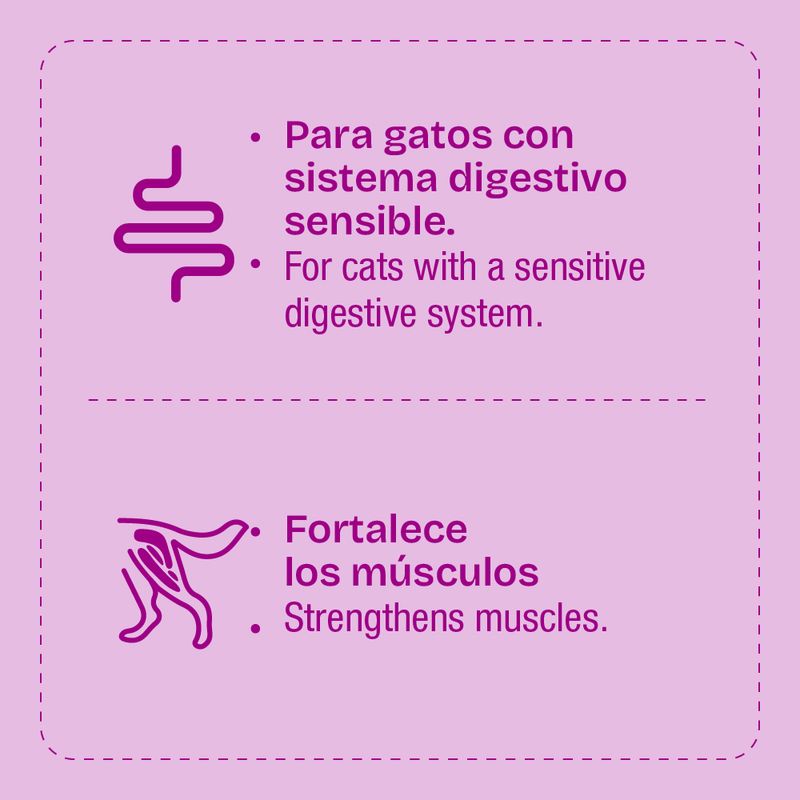Beneficios principales de Nutrecat Tilapia: Ideal para gatos con sistema digestivo sensible: proteína magra, altamente digestible y rica en aminoácidos que mantienen la salud intestinal y el equilibrio de la microbiota.
