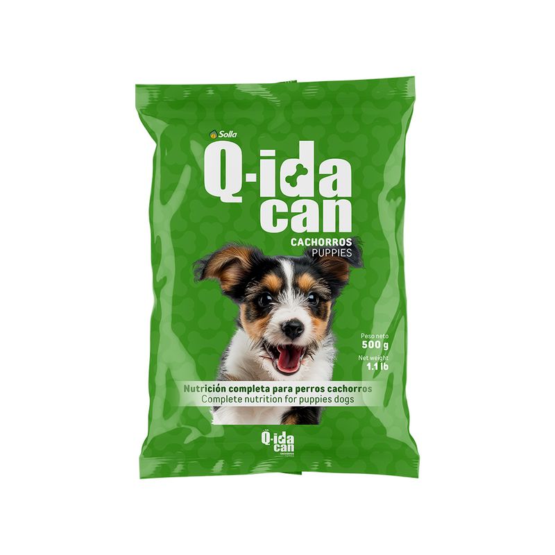 Q-ida Can Cachorros, es un alimento completo extruido para suministrar a cachorros desde la cuarta semana de vida como complemento a la leche materna, hasta el destete, en cantidades de 35 gramos por kilo de peso corporal, repartido en cinco comidas diarias. Después del destete y hasta cumplir un año de vida, suministrar el alimento en tres comidas diarias.