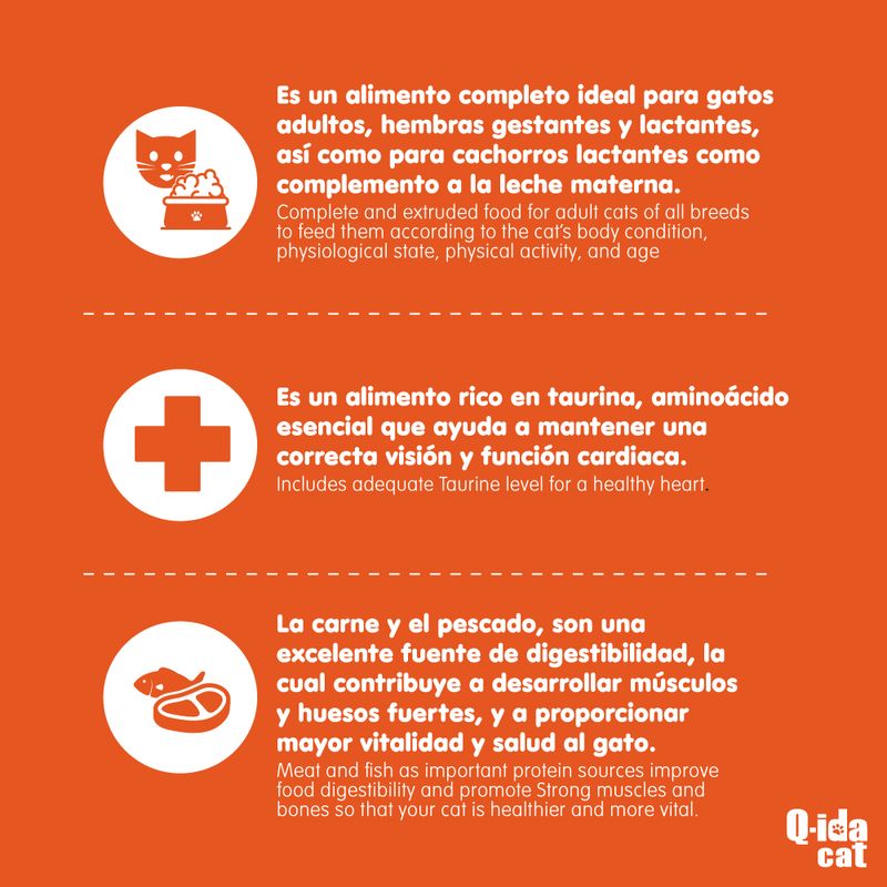 Q-Ida Cat , es un alimento completo extruido para suministrar a gatos adultos, de acuerdo a la edad del animal, tamaño y actividad. Tiene un rico sabor para agradar a tu gato.