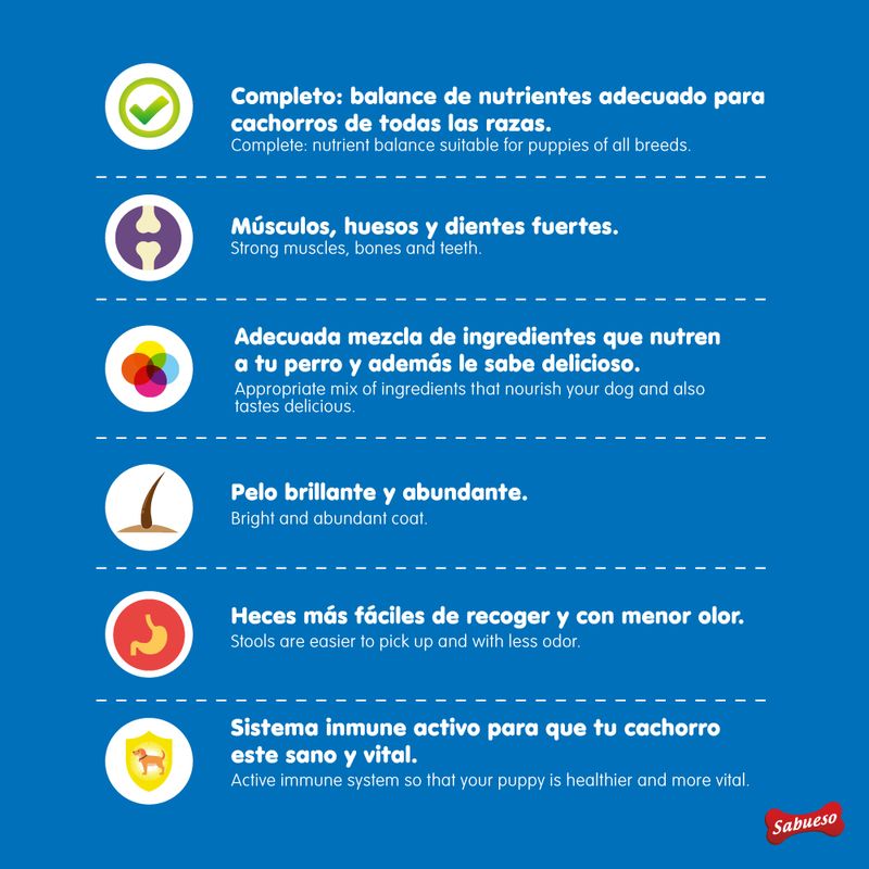 Sabueso cachorros, es un alimento completo para suministrar a cachorros desde la cuarta semana de vida como complemento a la leche materna, hasta el destete en cantidad de 30 gramos por kilo de peso. Después del destete y hasta cumplir un año de vida, suministrar el alimento en tres comidas diarias.
